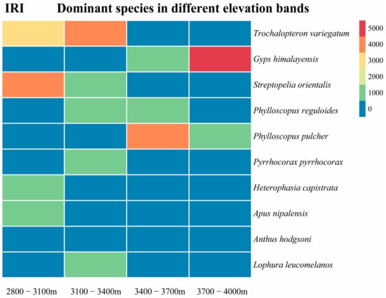 A total of 76 bird species were recorded in the study area, belonging to eight orders, 30 families, and 53 genera. Passeriformes were the most dominant order, with 64 species accounting for 84.21% of the total bird species. At the family level, Muscicapidae (11 species, 14.47%) and Phylloscopidae (nine species, 11.84%) were the dominant groups. At the genus level, Phylloscopus (eight species, 10.53%) was the dominant genus (Appendix A). Among the recorded species, five were classified as national second-class protected birds in China, including the Giant Laughingthrush (Garrulax maximus), Spotted Laughingthrush (Garrulax ocellatus), Kalij Pheasant (Lophura leucomelanos), Himalayan Buzzard (Buteo refectus), and Himalayan Vulture (Gyps himalayensis). One species, the Himalayan Vulture, was categorized as Near Threatened (NT) according to the IUCN Red List (Table 1). According to the IRI analysis (Figure 2), the dominant bird species in different elevation bands are as follows: In the 2800–3100 m elevation band, the dominant species are the Variegated Laughingthrush (Trochalopteron variegatum), Oriental Turtle Dove (Streptopelia orientalis), Rufous Sibia (Heterophasia capistrata), and House Swift (Apus nipalensis). In the 3100–3400 m elevation band, the dominant species are the Variegated Laughingthrush, Oriental Turtle Dove, Red-billed Chough (Pyrrhocorax pyrrhocorax), and Kalij Pheasant (Lophura leucomelanos). In the 3400–3700 m elevation band, the dominant species are the Himalayan Vulture (Gyps himalayensis), Blyth’s Leaf Warbler (Phylloscopus reguloides), and Buff-barred Warbler (Phylloscopus pulcher). In the 3700–4000 m elevation band, the dominant species are the Himalayan Vulture and Buff-barred Warbler.