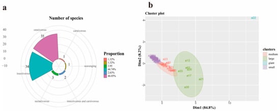 The composition of foraging guilds and morphological groups of breeding birds in the Gyirong Valley. (a) The species composition of bird foraging guilds. Insectivorous birds and omnivorous birds are the main groups. (b) The cluster analysis of birds with different morphological characteristics based on the Kmeans clustering method.