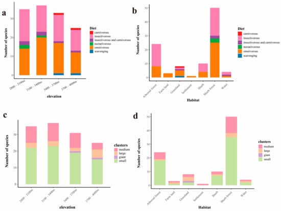 The distribution of birds across different foraging guilds along the elevation gradient was analyzed. In the 2800–3100 m elevation band, a total of 35 bird species were recorded, including insectivorous (17 species, 48.57%), insectivorous–carnivorous (two species, 5.71%), nectarivorous (two species, 5.71%), and omnivorous (14 species, 40.00%) birds. In the 3100–3400 m elevation band, 37 bird species were recorded, including insectivorous (14 species, 37.84%), insectivorous–carnivorous (two species, 5.41%), nectarivorous (one species, 2.70%), and omnivorous (20 species, 54.05%) birds. In the 3400–3700 m elevation band, 33 bird species were recorded, including carnivorous (one species, 3.03%), insectivorous (14 species, 42.42%), insectivorous–carnivorous (one species, 3.03%), omnivorous (16 species, 48.49%), and scavenging (one species, 3.03%) birds. In the 3700–4000 m elevation band, 25 bird species were recorded, including carnivorous (one species, 4.00%), insectivorous (11 species, 44.00%), insectivorous–carnivorous (one species, 4.00%), omnivorous (11 species, 44.00%), and scavenging (one species, 4.00%) birds. Carnivorous and scavenging birds, which are large raptors, prefer the high-altitude areas between 3400 and 4000 m in the study area. Nectarivorous birds, mainly sunbirds, are active in the 2800–3400 m elevation band. Insectivorous and omnivorous birds are the most diverse and widely distributed across all elevation bands in the study area. Insectivorous–carnivorous birds are active across the entire elevation range from 2800 to 4000 m (Figure 4a). An analysis of the habitat environments of different foraging guilds of birds revealed the following: In the arbor forest habitat, 24 bird species were recorded, including insectivorous (16 species, 66.67%) and omnivorous (eight species, 33.33%) birds. In the farmland habitat, three bird species were recorded, all of which were omnivorous. In the grassland habitat, eight bird species were recorded, including carnivorous (one species, 12.50%), insectivorous (one species, 12.50%), insectivorous–carnivorous (one species, 12.50%), omnivorous (four species, 50.00%), and scavenging (one species, 12.50%) birds. In residential areas, one bird species was recorded, which was omnivorous. In the shrubland habitat, 10 bird species were recorded, including insectivorous (six species, 60.00%) and omnivorous (four species, 40.00%) birds. In the shrub forest habitat, 50 bird species were recorded, including insectivorous (20 species, 40.00%), insectivorous–carnivorous (two species, 4.00%), nectarivorous (three species, 6.00%), and omnivorous (25 species, 50.00%) birds. In the wetland habitat, four bird species were recorded, including insectivorous (two species, 50.00%), insectivorous–carnivorous (one species, 25.00%), and omnivorous (one species, 25.00%) birds. Insectivorous and omnivorous birds are mainly active in arbor forests and shrub forests and are distributed across various habitats. Large raptors that are carnivorous and scavenging primarily inhabit grassland environments. Nectarivorous birds are mainly found in shrub forests. Insectivorous–carnivorous birds are distributed across all elevation bands but are primarily active in farmlands, wetlands, and shrub forests between 2800 and 3400 m. Habitats closely associated with human activities are predominantly occupied by omnivorous and insectivorous birds that are less wary about humans. Specialized bird species, such as the Plumbeous Water Redstart (Phoenicurus fuliginosus), Blue Whistling (Myophonus caeruleus), and White-capped Redstart (Phoenicurus leucocephalus), are found in wetland habitats (Figure 4b). The distribution of different bird groups across elevations was analyzed. In the 2800–3100 m elevation band, 35 bird species were recorded, including “medium” (10 species, 28.57%), “large” (three species, 8.57%), and “small” (22 species, 62.86%). In the 3100-3400 m elevation band, 37 bird species were recorded, including “medium” (11 species, 29.73%), “large” (3 species, 8.11%), and “small” (23 species, 62.16%). In the 3400–3700 m elevation band, 31 bird species were recorded, including “medium” (nine species, 29.03%), “large” (two species, 6.45%), “giant” (one species, 3.23%), and “miniature” (19 species, 61.29%). In the 3700–4000 m elevation band, 25 bird species were recorded, including “medium” (four species, 16.00%), “large” (five species, 20.00%), “giant” (one species, 4.00%), and “small” (15 species, 60.00%). “Small”, “medium”, and “large” are distributed across all elevation bands, while “giant” birds are mainly active in the 3400–4000 m elevation band (Figure 4c). An analysis of the habitat environments of different bird groups revealed the following: In the arbor forest habitat, 24 bird species were recorded, including “medium” (five species, 20.83%), “large” (one species, 4.17%), and “small” (18 species, 75.00%). In the farmland habitat, three bird species were recorded, including “medium” (one species, 33.33%), “large” (one species, 33.33%), and “small” (one species, 33.33%). In the grassland habitat, eight bird species were recorded, including “medium” (two species, 25.00%), “large” (three species, 37.50%), “giant” (one species, 12.50%), and “small” (two species, 25.00%). In residential areas, one bird species was recorded, which was “medium”. In the shrubland habitat, 10 bird species were recorded, including “medium” (two species, 20.00%), “large” (one species, 10.00%), and “small” (seven species, 70.00%). In the shrub forest habitat, 50 bird species were recorded, including “medium” (12 species, 24.00%), “large” (three species, 6.00%), and “small” (35 species, 70.00%). In the wetland habitat, four bird species were recorded, including “medium” (one species, 25.00%), “large” (one species, 25.00