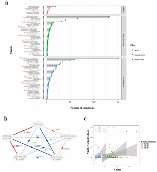 The influence of ecological traits on the composition of breeding birds in the Gyirong Valley. (a) The influence of diet on the population size of birds. (b) The influence of morphological characteristics on bird families. “*” indicates p < 0.05, “**” indicates p < 0.01, “***” indicates p < 0.001 (c) The relationship between the number of individual birds and morphological characteristics (Ta/Bw is tail length/body weight, Ta/Bl is tail length/body length, Tr/Bl is Tarsometatarsus length/body length).