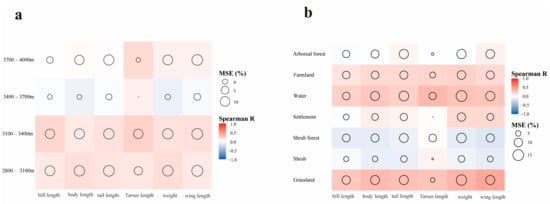 The combined results of correlation analysis and Random Forest modeling show that in the Gyirong Valley, at the 2800–3400 m elevation band, morphological traits of birds, such as bill length, body length, tail length, tarsus length, weight, and wing length, are positively correlated with bird population size. That is, the larger these morphological traits of birds are in this elevation band, the larger their population size. Birds with larger tarsus length, weight, and wing length also have larger population sizes in the 3700–4000 m elevation band (Figure 6a). In terms of habitat, birds with larger bill length, body length, tail length, tarsus length, weight, and wing length tend to have larger population sizes in open habitats, such as grasslands, wetlands, and farmlands. In contrast, birds with smaller morphological traits are mainly distributed in shrublands and shrub forests (Figure 6b).