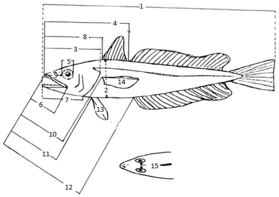 Morphometric and meristic characters of M. merluccius (after [17]): total length 1, body depth 2, head length 3, snout length 4, diameter of orbit 5, upper jaw length 6, lower jaw length 7, length from tip of snout to first dorsal fin origin 8, length from tip of snout to second dorsal fin origin 9, length from tip of snout to pectoral fin insertion 10, length from tip of snout to pelvic fin insertion 11, length from tip of snout to anal fin origin 12, pelvic fin length 13, pectoral fin length 14, interorbital length 15.