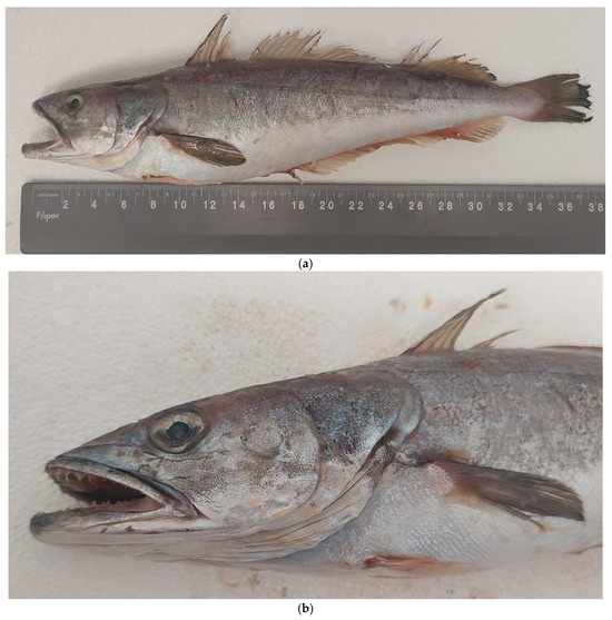 (a,b) The sampled specimen, M. merluccius (♂), TL = 375 mm; W = 417.5 g, captured from the Bulgarian Black Sea offshore waters on 27 July 2023.