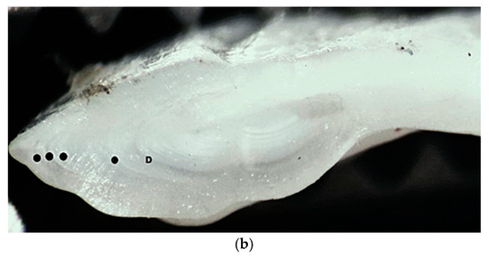 European hake (M. merluccius) otolith (sagitta) from the studied specimen: (a) external appearance (magnification ×10); (b) cross-section—● annual rings, D demersal ring.