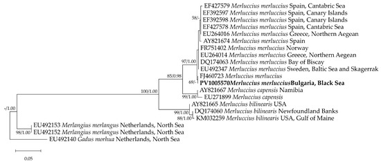 The obtained sequence was compared with reference sequences in the GenBank database [25] using the BLAST (Basic Local Alignment Search Tool, https://blast.ncbi.nlm.nih.gov, accessed on 3 February 2025), and species identification was performed by comparing sequence similarity. Preferably, sequences from published articles or from FishTrace [26] were selected to ensure greater taxonomic reliability. The sequence of the studied Black Sea specimen was aligned with the cyt b sequences of M. merluccius from other locations, Merluccius capensis, and Merluccius bilinearis, with Merlangus merlangus and Gadhus morhua used as an outgroup taxa, using MUSCLE [27] with the default settings in MEGA 12 [24]. The total number of nucleotide sequences was 20, and 333 positions were included in the final dataset used for the phylogenetic analyses. All the sites were used for the analyses. The phylogenetic relationships were determined using the maximum likelihood (ML) method in MEGA 12 [24] and the Bayesian inference (BI) method in MrBayes v.3.2 [28]. For the BI method, four Markov chain Monte Carlo (MCMC) chains were run for 1,000,000 generations, sampling every 100 generations. The first 25% of burn-in trees were discarded. The phylogenetic tree was represented using the ML results, with bootstrap values from the ML method (1000 replicates) and posterior probabilities from the BI method. The model used for both the ML and BI analyses was the general time-reversible (GTR) model with a discrete gamma distribution (+G), as selected by MEGA 12 [24] for ML and MrModeltest2 [29] for BI, based on the lowest Akaike information criterion (AIC) scores.