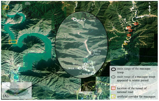 During the past four decades, the macaque population in the core sightseeing area increased gradually in the first three decades, peaked by the end of 2012 with over 500 individuals divided into over 7 groups, then experienced a massive collapse during 2013–2016 and included ca. 350 individuals grouped into 5 groups since 2017 (Figure 2) [33]. One group (named WLK-4) mainly patrols in the northern backyard of this area, and the other four groups (WLK-1A, WLK-1B, WLK-2, and WLK-3) primarily wander in the core area for tourist sightseeing. The investigated samples might be collected mainly from all these named groups but could not be assigned to a specific group due to difficulties in identifying deceased macaque or body remains except for a few characterized individuals.