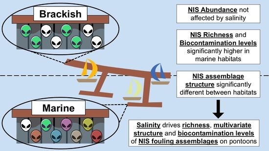 Our results partly supported the hypothesis that NIS assemblage structure and biocontamination levels will differ between recreational marinas according to salinity conditions, with higher biocontamination levels in marine than in brackish marinas. In this way, the present study emphasizes the importance of the habitat where a marina is located in terms of overall salinity conditions (brackish vs. marine), but we cannot attribute the observed pattern unambiguously to salinity without manipulative studies. Thus, the influence of other factors on NIS assemblages, such as pollution, intensity of boating, competition and predation, cannot be discarded [5,28,29,35,36,37,38]. However, to our knowledge, previous studies have not tested the effects of these factors on NIS in marine and brackish marinas, making it difficult to discuss them in detail in an explanation of our results.