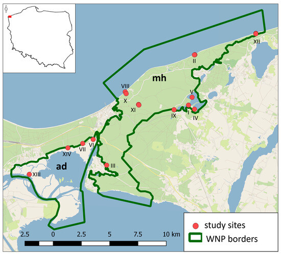 Location of study sites at which small mammal trapping was conducted within the borders of Wolin National Park. The number of each site corresponds to Table 1. mh—moraine hills (uplands), ad—alluvial delta (lowlands).