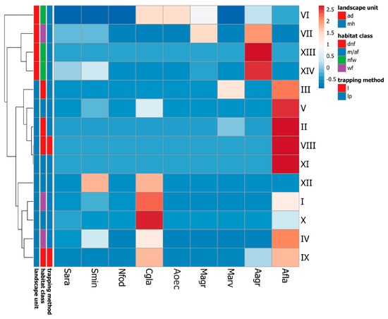 Comparison of species composition of small mammals trapped at particular study sites in Wolin National Park, subjected to cluster analysis (clustering method—complete linkage, Manhattan distance, and average cluster first). Only individuals identified unambiguously to the species level were taken into account. Number of every site corresponds to Table 1. Species: Sara—S. araneus, Smin—S. minutus, Nfod—N. fodiens, Cgla—C. glareolus, Aoec—Alexandromys oeconomus, Magr—M. agrestis, Marv—M. arvalis, Aagr—A. agrarius, and Afla—A. flavicollis. Landscape unit: mh—moraine hills (upland) and ad—alluvial delta (lowland). Habitat class: dnf—deciduous non-forest habitats, m/af—meso- and acidophilic forests on mineral soils, nfw—non-forest wetlands, and wf—wetland forests. Trapping method: l—live traps only and lp—live- and pitfall traps. Data from Table S1.