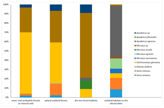 Structure of small mammal assemblages hosted by four different groups of habitats, distinguished by plant communities and topography. Meso- and acidophilic forests on mineral soils: sites V, X, XI, and XII (N = 150 captures; 329 trap-nights). Upland wetland forests: sites I and IV (N = 132 captures; 188 trap-nights). Dry non-forest habitats: sites II, III, VIII, and IX (N = 33 captures; 205 trap-nights). Wetland habitats on the alluvial delta: sites VI, VII, XIII, and XIV (N = 81 captures; 376 trap-nights).