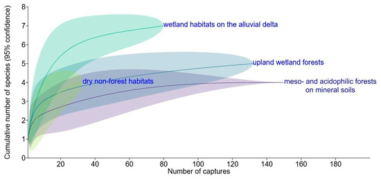 The species accumulation curves revealed the highest diversity in the wetland delta habitats (seven species), followed by the upland wetland forests (five species). In contrast, meso- and acidophilic forests on mineral soils had the lowest diversity, hosting only four species. In most habitat groups, the curves approached the asymptote, suggesting a low probability of detecting additional species with increased sampling effort. However, the dry non-forest habitats (four species) remained under-sampled (Figure 4).