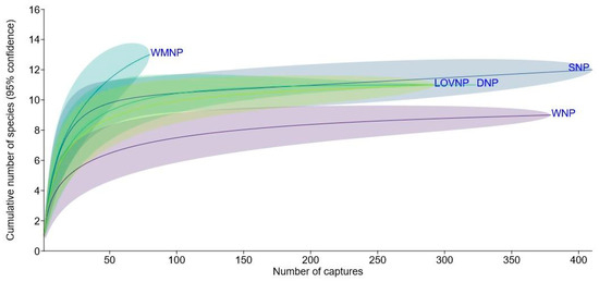Rarefaction curves for the cumulative numbers of species plotted against the numbers of small mammal captures in Wolin National Park (WNP) and four other national parks in the Polish Baltic Sea Coast and Lower Oder catchment. DNP—Drawieński National Park, LOVNP—Lower Oder Valley National Park, SNP—Słowiński National Park, and WMNP—Warta Mouth National Park (data in Table S2).