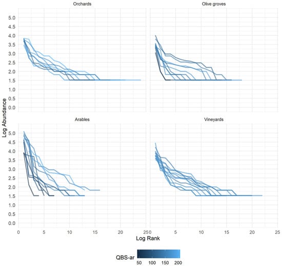 Whittaker plots showing the relationship between log-transformed rank and abundance across different cultivation types. Each line represents an individual sample, grouped by Sample ID. Colors indicate different QBS-ar values, reflecting soil biological quality. Fixed scales across facets ensure comparability between models.