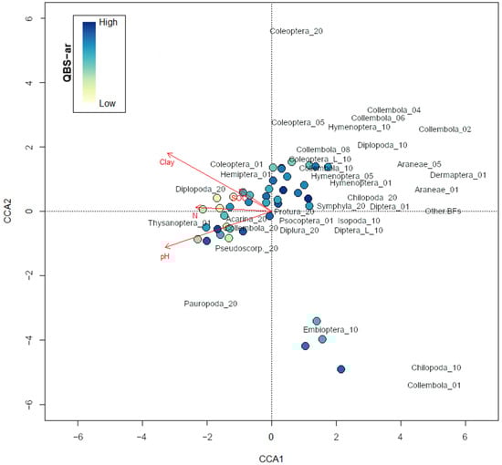 Despite the moderate quality of the representation offered by the CCA, it is quite clear that some community characteristics were explained by the environmental variables considered, with pH and clay content being the most significant factors. The negative correlation between pH and QBS-ar values suggests that alkaline soils may limit certain biological processes thus potentially reducing habitat suitability for certain taxa [41,42,43,44]. Similarly, higher clay content was associated with lower QBS-ar values, probably due to physical constraints on soil fauna mobility and habitat availability in more compact soils [45]. Conversely, unlike what has been reported in other studies [46,47], SOC did not significantly affect community composition.