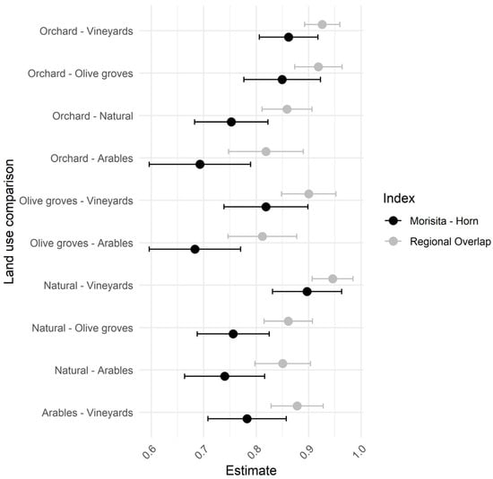 Shared species: estimated values and respective confidence intervals (95%) of Morisita–Horn index and regional overlap index for all land-use pairs.