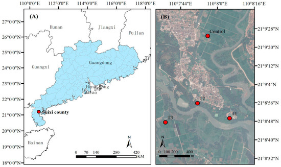 The Leizhou Peninsula, with the largest expanse of mangrove forests in Guangdong Province, has been designated a mangrove reserve since 1991 [24]. Over the past five years, the region has experienced an annual average temperature of 23.86 °C and received an average yearly precipitation of 1910.96 mm, according to meteorological data obtained from the WorldClim data website (https://www.worldclim.org/data/monthlywth.html#). This location harbors the largest known B. racemosa community in mainland China. The soil and plant samples for this study were collected from the mangrove communities in the coastal regions situated in the Xibian Village Group (21°8′50.00″ N/110°8′2.00″ E; 21°9′10.30″ N/110°8′2.90″ E) and the Xipo Village (110°07′34″ E; 21°08′50″ N) in the Chengyue Town of Suixi County (Zhanjiang City, Guangdong Province, China; Table 1 and Figure 1).