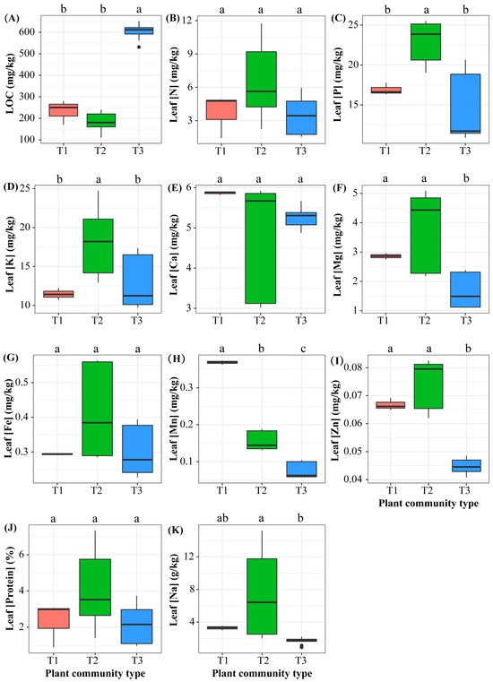 Leaf traits of different mangrove communities. LOC, leaf organic carbon (A); Leaf [N], leaf nitrogen (B); Leaf [P], leaf phosphorus (C); Leaf [K], leaf potassium (D); Leaf [Ca], leaf calcium (E); Leaf [Mg], leaf magnesium (F); Leaf [Fe], leaf iron (G); Leaf [Mn], leaf manganese (H); Leaf [Zn], leaf zinc (I); Leaf [Protein], leaf protein (J); Leaf [Na], leaf sodium (K). Lowercase letters indicate significant differences among different mangrove community types based on the Duncan test (p < 0.05). Error bars indicate standard error (SE, n = 3). T1, T2, and T3 indicate the B. racemosa pure community, the B. racemosa + Acanthus ilicifolius community, and the B. racemosa + Talipariti tiliaceum + Pongamia pinnata community, respectively.