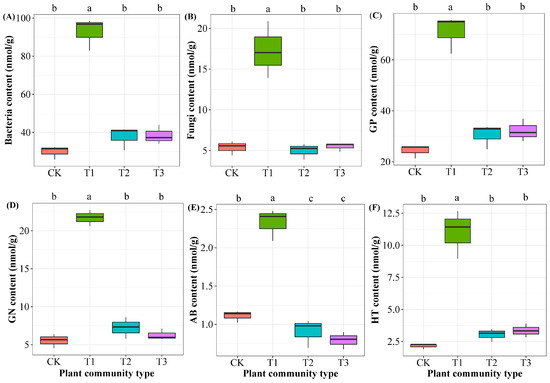 Composition and content of soil bacteria (A) and fungi (B) associated with different plant communities based on PLFA analysis. GP, gram-positive bacteria (C); GN, gram-negative bacteria (D); AB, aerobic bacteria (E); HT, hylophilus thermolyticus (F). Lowercase letters indicate significant differences among the plant community types (p < 0.05). Error bars indicate standard errors (SE, n = 3). CK, T1, T2, and T3 indicate the rice field, the B. racemosa pure community, the B. racemosa + Acanthus ilicifolius community, and the B. racemosa + Talipariti tiliaceum + Pongamia pinnata community, respectively.