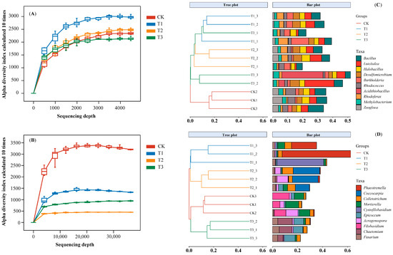Furthermore, the soil samples were sequenced to assess the composition and diversity of soil bacteria and fungi associated with different B. racemosa communities. After processing the raw reads, 329,092 and 837,661 high-quality sequences were obtained for the bacterial and fungal datasets, which were further clustered into 17,187 and 14,378 OTUs at 97% similarity levels. The rarefaction curves demonstrated good sequencing depth coverage (around 3000 and 20,000, respectively) and indicated differences in the bacterial (Figure 4A) and fungal (Figure 4B) communities. Further hierarchical clustering analysis based on Euclidean distance showed that the bacterial communities in the rice field (CK) clustered as one group, while those in the mangrove communities (T1, T2, T3) clustered as another group (Figure 4C). Meanwhile, the fungal communities of CK and T3 clustered as one group, while those of the T1 and T2 mangrove forests clustered as another group (Figure 4D). The bar charts showed that, although the microbial composition was similar, their abundance was different.