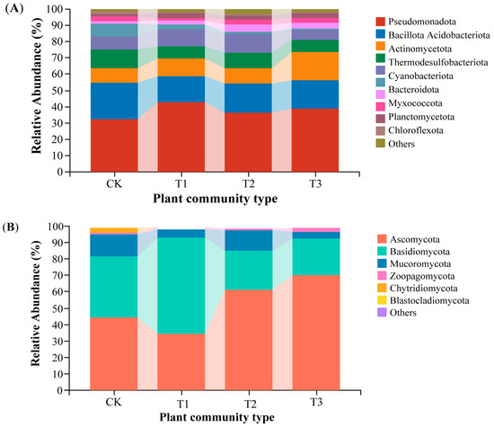 Histogram shows the relative abundance of bacterial (A) and fungal (B) phyla associated with different plant community types. Only the top 10 most abundant taxa are shown; the remaining taxa were combined and shown as others. CK, T1, T2, and T3 represent the rice field, the B. racemosa pure community, the B. racemosa + Acanthus ilicifolius community, and the B. racemosa + Talipariti tiliaceum + Pongamia pinnata community, respectively.