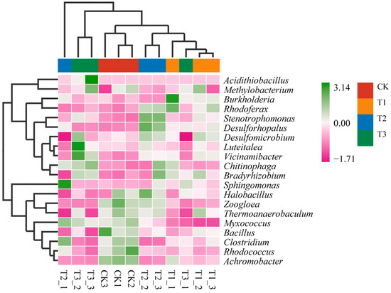Then, a hierarchical clustering and heatmap based on the abundance of the phyla was performed to assess the structure of the microbial communities (Figure 6). Unweighted pair group method with arithmetic mean (UPGMA) clustering based on the Euclidean distance of the species composition showed that the changes in bacterial community structure were significantly correlated with the relative abundance of Desulfomicrobium, Myxococus, and Thermoanaerobaculum in the B. racemosa pure and associated communities (Figure 6). An increase in the abundance of these three genera led to high diverse microbial community and soil environmental heterogeneity among the four mangrove plant communities.