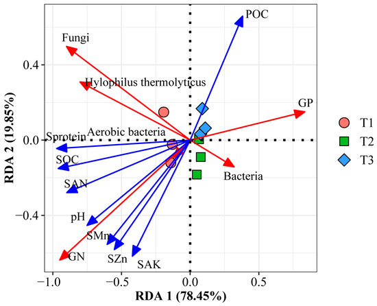 Ordination plots of the results from the redundancy analysis (RDA) performed to identify the relationships between the microbial community (red arrows) and the plant and soil characteristics (blue arrows). T1, T2, and T3 indicate the B. racemosa pure community, the B. racemosa + Acanthus ilicifolius community, and the B. racemosa + Talipariti tiliaceum + Pongamia pinnata community, respectively. SOC, soil organic carbon; SAN, soil available nitrogen; SAK, soil available potassium; SMn, soil manganese; SZn, soil zinc; SProtein, soil total protein; pH, soil pH; POC, plant leaf organic carbon.
