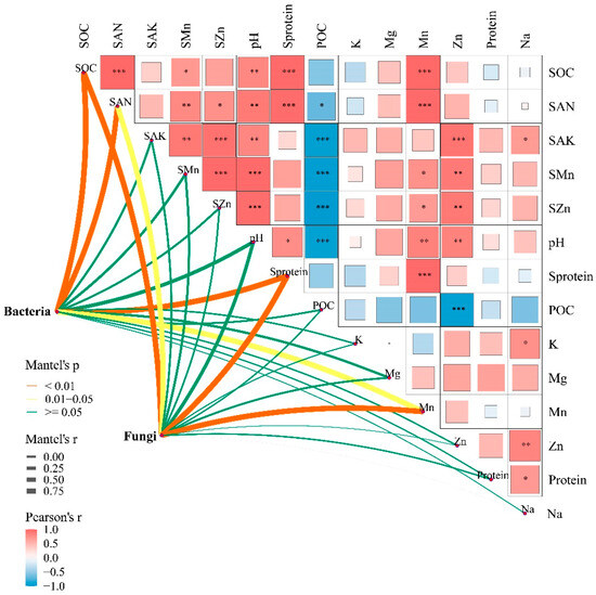 Mantel’s test of Pearson’s correlations between the soil microbes and the plant and soil variables. ***, **, and * indicate correlations are significant at p < 0.001, p < 0.01, and p < 0.05, respectively. Blank squares indicate correlations are not significant. The size of the square represents the size of the correlation coefficient. SOC, soil organic carbon; SAN, soil available nitrogen; SAK, soil available potassium; SMn, soil manganese; SZn, soil zinc; SProtein, soil total protein; pH, soil pH; POC, plant leaf organic carbon; K, leaf potassium; Mg, leaf magnesium; Mn, leaf manganese; Zn, leaf zinc; Protein, leaf protein; Na, leaf sodium. The blue and red boxes indicate positive and negative relations, respectively. The line thickness indicates Mantel’s correlation between the microbes and the plant and soil variables, and the line colors represent the p-value range. The size of the boxes indicates the degree of the correlation.