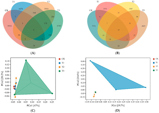 Venn diagram of the bacterial (A) and fungal (B) OTUs, and the principal coordinates analysis (PCoA) plots based on the Bray–Curtis distances of the bacteria (C) and fungi (D) associated with different plant communities. Here, CK, T1, T2, and T3 indicate the rice field, the B. racemosa pure community, the B. racemosa + Acanthus ilicifolius community, and the B. racemosa + Talipariti tiliaceum + Pongamia pinnata community, respectively.