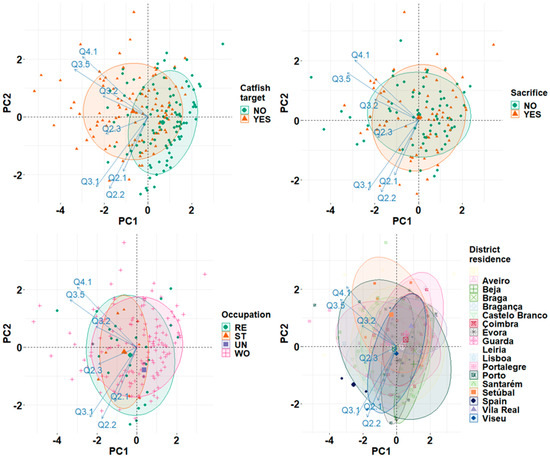 Principal Component Analyses (PCA) were performed to reduce data dimensionality and determine the major drivers of anglers’ behaviors and perceptions regarding European catfish invasion and impacts. These were analyzed considering specific angler sociodemographic groups, namely, gender (Q1.1), age (Q1.2), occupation (Q1.3), and district of residence (Q1.4), as well as practices, such as angling experience (Q2.1), angling frequency (Q2.2), distance willing to travel on an angling trip (Q2.3), their self-awareness about the species knowledge (Q3.1), the angling activity targeting specifically the European catfish (Q3.2), the practice of catch & release (Q3.4), to what extent do anglers consider that European catfish is beneficial to the development of angling (Q3.5), and if anglers consider that European catfish has a positive impact on other fish species (Q4.1). These variables were already selected [11,40,41] as potential mensurable characteristics shaping Iberian sport-recreational anglers’ conduct and viewpoints of angling activity in freshwater ecosystems. The mean coordinates of each group in the main PCA axes were compared by variance analysis (95% confidence interval) and significantly different groups were ascertained using Tukey’s tests (95% confidence interval).
