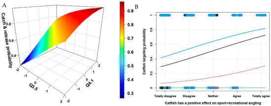 Probability of the angler practice catch & release according to his/her agreement ((A); −2—totally disagree, −1—disagree, 0—neither agree nor disagree, 1—agree, 2—totally agree) with the statements that catfish has a positive effect in the development of sport-recreational angling (Q3.5) and that it brings positive effects to the native fish populations (Q4.1). The probability of the angler targeting catfish during angling according to his agreement ((B); −2—totally disagree, −1—disagree, 0—neither agree nor disagree, 1—agree, 2—totally agree) that catfish has a positive effect in the development of sport-recreational angling (Q3.5), and occupation (black—retired, pink—student, green—unemployed, and blue—working).