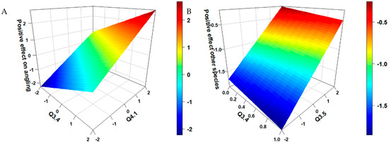 Inference of the anglers’ opinion regarding the positive effect of catfish on sport-recreational angling (A) as a function of catfish angling frequency (Q3.2) and their opinion about the positive impact on native fish species (Q4.1); and the anglers’ opinion regarding the positive effect of catfish on native fish species communities (B) as a function of how many years anglers have been angling (Q2.1) and their agreement with the statement that the catfish is beneficial to the development of sport-recreational angling (Q3.5).