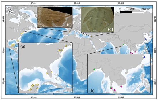 Distribution of the samples of horseshoe crabs used for this study: (a) localities of L. polyphemus samples (yellow points); (b) localities of the Asian specimens: green for T. gigas, pink for C. rotundicauda, and blue for T. tridentatus; (c) type locality of the fossil specimen T. gadeai from Tarragona, Spain (from: []); and (d) fossil specimen of T. syriacus from Lebanon (from: []; Photo credit: Stephen Pates).