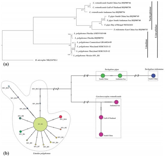 Phylogenetic and phylogeographic relationships between the American and Asian horseshoe crabs based on the partial COI sequences: (a) Bayesian Inference phylogeny of the extant Limulidae species, and (b) Statistical parsimony haplotype network linking the L. polyphemus clade to Asian species. Dotted lines encompass the different species and numbers between diagonal lines indicate mutational steps. The SF1 dataset was used (see Section 2 for details).