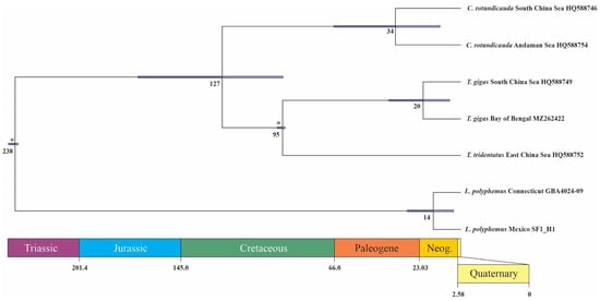 To estimate the divergence time between the horseshoe crab clades, we considered a sample section of the SF1 dataset which consisted of the following: (1) for the Asian horseshoe crabs, one individual of T. tridentatus from the East China Sea, two individuals of T. gigas from the Bay of Bengal and the South China Sea, corresponding to geographically distant populations with a genetic gap [], as well as two individuals of C. rotundicauda from the Andaman Sea and South China Sea, reported as possible cryptic species [] (Figure 1b); (2) for the American horseshoe crab, we included one specimen from Laguna de Términos (Mexico) and one from Connecticut, northeastern US, consistent with the two extremes of its distribution.