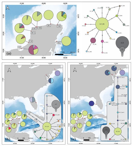 Statistical parsimony networks of haplotypes and their geographic distribution from (a) the LF dataset, (b) the SF1 dataset, and (c) the SF2 dataset (see details of the datasets in Section 2). Abbreviations for Mexican localities: Laguna de Términos (LT), Champotón (CH), Ría Celestún (RCL), Chuburná (CHU), Chelem (CHE), Ría Lagartos (RL), Yum Balam (YB), and Sian Ka’an (SK).