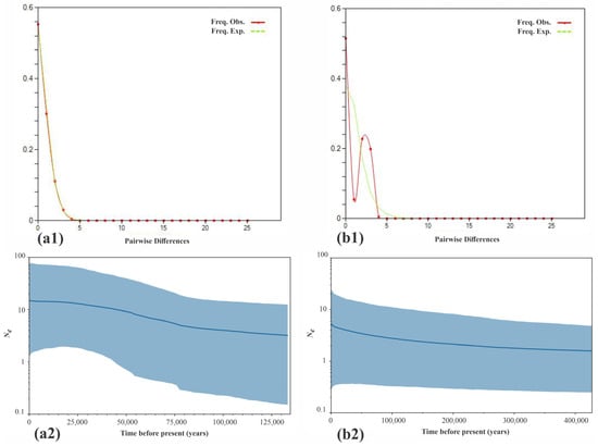 Tajima’s D and Fu’s Fs demographic indices (Table 1) were significantly negative in Mexico for both LF and SF2 datasets, suggesting population expansion. This is reinforced by the mismatch distributions, which showed an unimodal distribution, typical of a population that has undergone expansion, and a non-significant raggedness index value (LF dataset: r = 0.332, p = 0.121; SF2 dataset: r = 0.532, p = 0.519) (Figure 5(a1)). The Bayesian skyline plot for this population demonstrated a sharp increase over the last 75,000 years (for the LF dataset; Figure 5(a2)).