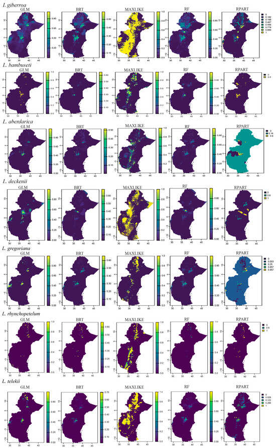 The species distribution models for each species (L. giberroa, L. bambuseti, L. aberdarica, L. deckenii, L. gregoriana, L. rhynchopetalum, and L. telekii) are presented across five modeling approaches: glm, brt, maxlike, rf, and rpart. The habitat suitability predictions for the seven species show variability across models. L. giberroa has high suitability in the northern region, with maxlike and brt predicting the largest areas. L. bambuseti is most suitable in the central and southern regions according to maxlike and brt. L. aberdarica shows extensive suitability with maxlike and rf, while glm and rpart predict more restricted habitats. L. deckenii has high suitability in the center, but the south is unsuitable across all the models. L. gregoriana shows widespread suitability in the northeast, while glm and brt show moderate suitability in other areas. L. rhynchopetalum has high suitability in the central and eastern regions, with more fragmented areas in rpart. L. telekii shows consistent suitability in the center, with a decrease in the south (Figure 2).