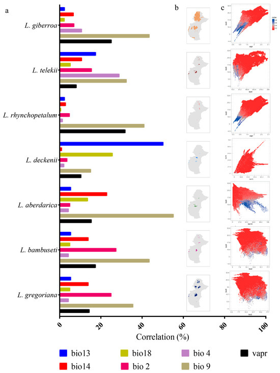 The most important variables limiting the L. aberdarica distribution were bio9, with contributions of 55.30%, and bio14, with contributions of 23%. The most important variables limiting the L. deckenii distribution were bio13, with contributions of 50.30%, and bio18, with contributions of 25.70%. For L. telekii, it was bio9 with contributions of 32.50, and bio4 with contributions of 29% limiting the distribution of L. telekii. In summary, bio9 was identified as the most significant variable limiting the distribution of most Lobelia species, except for L. deckenii (Figure 3c and Figure S2).
