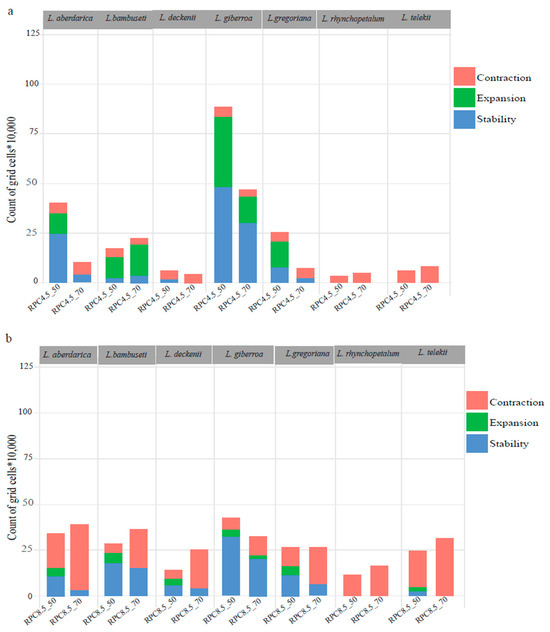 According to the IUCN recommendations, it is very important when determining species distribution change scenarios under climate change to consider merging them with the IUCN criteria for species conservation according to the area of occupancy to evaluate extinction risks [41]. To ensure that our study does not overlook this situation, we applied the suggested recommendations in our projections, whereby the percentage loss in AOO for the changes was calculated in both RCP4.5 and RCP8.5 for the estimated years using the criteria as follows: species with loss of above 30%—loss, above than 50%—endangered, above than 80%—critically endangered, and 90–100%—extinct [50].