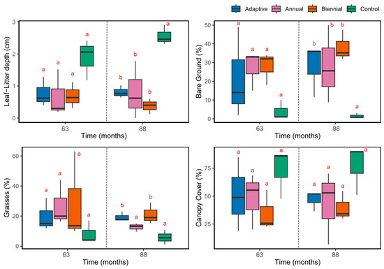 Differences in vegetation structure (leaf-litter depth, bare ground, grass cover and canopy cover) between dense savanna plots subject to different fire regimes, as measured 63 and 88 months after the beginning of the fire experiment. The different letters above the boxplots indicate statistically significant differences between the fire regimes.