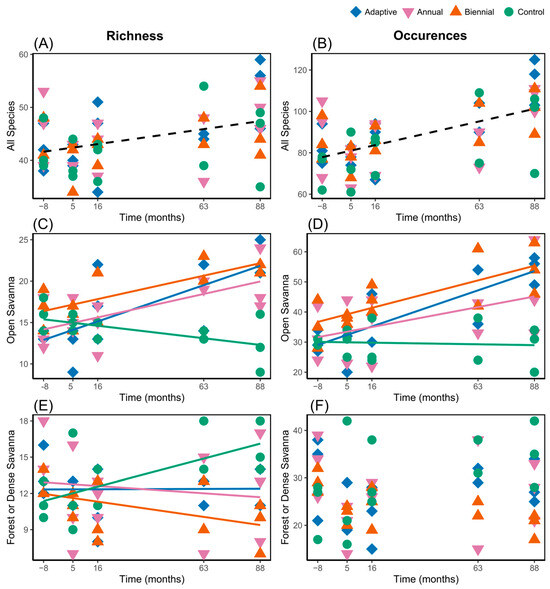 Scatterplots of the relationship between ant species richness and occurrences (number of species records per plot) and time since the beginning of the fire experiment ((A,B), all species; (C,D), open savanna specialists; (E,F), forest or dense savanna specialists). The black dashed lines represent the overall effect of time on species richness or occurrences, independently of the fire regime. Lines with different colors represent the significant interaction between the effects of time and fire regime.