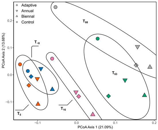 Principal Coordinate Analysis (PCoA) plot showing the differences in ant species composition between the different fire regimes prior to the beginning of the experiment (T−8), and 5, 16, 63 and 88 months later. Data from different plots (n = 3 plots per treatment) were combined for clarity as well to increase the sampling completeness per treatment. The colors indicate different times since the beginning of the fire experiment and ellipses indicated 95% confidence intervals.