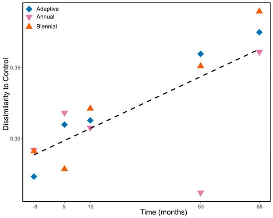 Dissimilarity in ant species composition (relative to control, unburned plots) of plots subjected to different fire regimes in relation to time since the beginning of the fire experiment. The black dashed line represents the significant effect of time on the dissimilarity in ant species composition, independently of the fire regime.