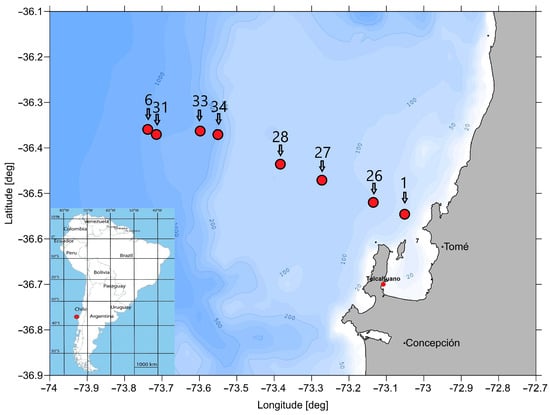 Map with the eight analysed stations and the bathymetry off Concepción, Chile.
