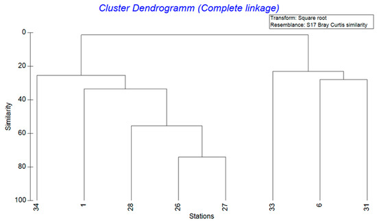 Cluster dendrogram of the stations with a square root transformation based on the species abundances with calculation of the distance using the Bray–Curtis similarity measure.