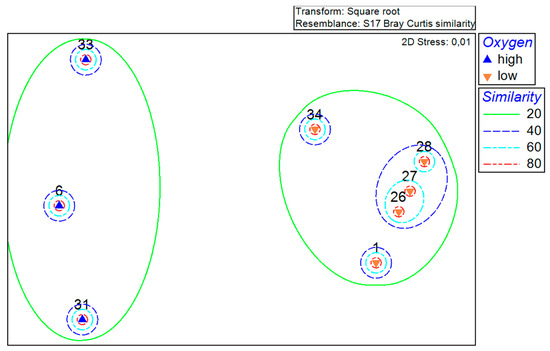 The established grouping of the stations has been further clarified with the help of the MDS plot (Figure 3). The distances between the points on the plot represent the similarities and, as in the previous figure, are based on Bray–Curtis similarity. The stations are again divided into the same two different groups, with 3 and 5 stations. In addition to the similarity levels in the MDS plot, the oxygen content is shown as ‘high’ (>100 µmol/L) and ‘low’ (<2 µmol/L) for each station.