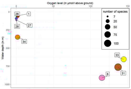 Number of species (circle diameter) in relation to the oxygen content and the water depth of the individual stations (numbers in frame).