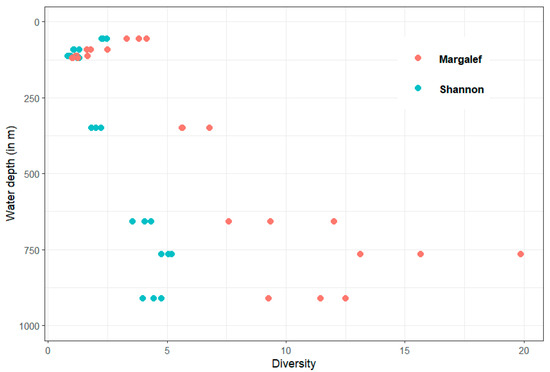Shannon and Margalef indexes in relation to water depth with three replicates for each station.
