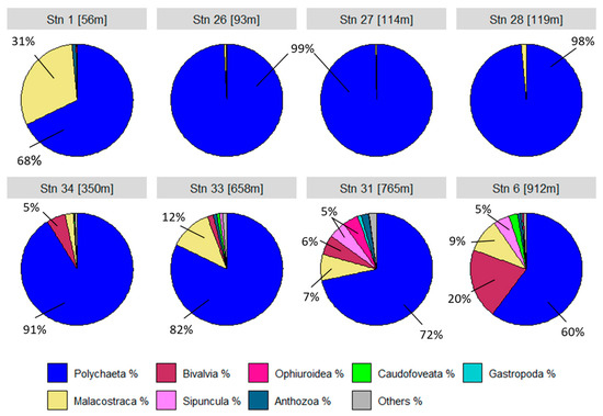 The species communities at the stations are largely made up of the polychaete class (Figure 7). At station 1, the higher crustaceans (Malacostraca) account for just over a quarter. Bivalves appear from station 34 onwards and account for around 20% at the deepest station 6. The grey area in the pie charts represents all other classes that make up no more than 1%. These include the classes Priapulida, Scaphopoda, Solenogastres, Nemertea, Brachiopoda, Polyplacophora and Clitellata. This diversity of the community is particularly evident at stations 33, 31 and 6 with the highest oxygen levels.