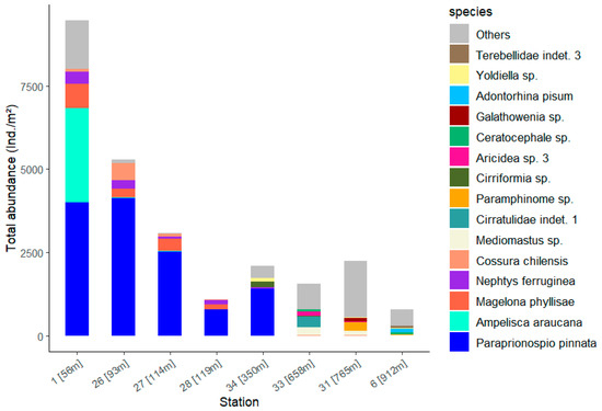 The species with high SIMPER contributions to the difference between the stations show high abundances at the stations in low water depths (Figure 9, Table S5). In addition to the numerous polychaetes, the amphipod Ampelisca araucana at Station 1 accounts for around a quarter of the total abundance and is thus in second place after Paraprionospio pinnata. P. pinnata occurs only at the stations at a water depth of 56 to 350 metres with very high abundance. It makes a significant contribution to the total abundance at Station 1, which shows the highest total abundance with 9473 Ind./m2 (Table 2). At the deeper stations 33, 31 and 6 with water depths greater than 600 m, the abundance is made up of many different species; at station 31 in particular, the column is mainly filled by the summarised ‘Other’ species. This collective term ‘Others’ summarises all species that contribute less than 5% to the total abundance at the stations.